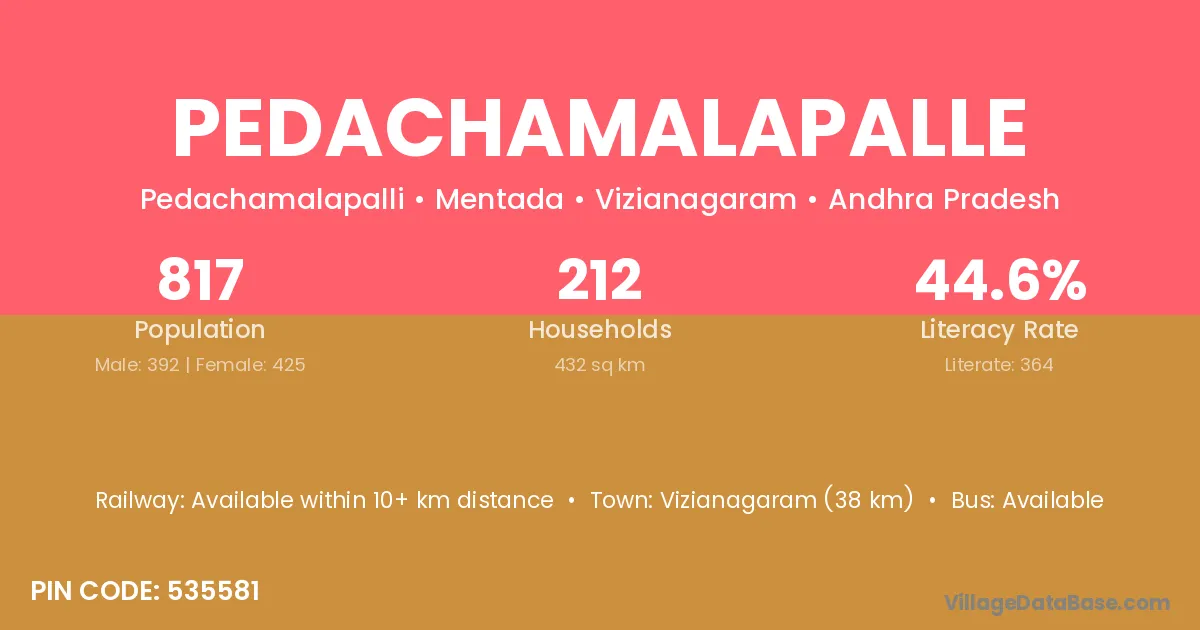Vizianagaram (38 km) is the nearest town to Pedachamalapalle village for major economic activities and is located approximately 38 km away.