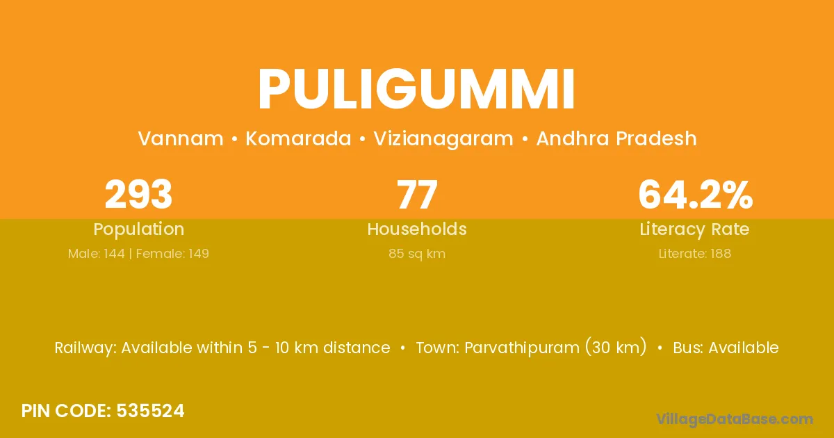 Vizianagaram (40 km) is the nearest town to Puligummi village for major economic activities and is located approximately 40 km away.