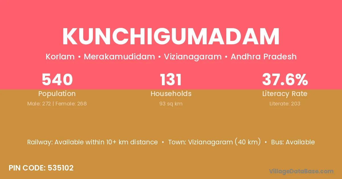Vizianagaram (40 km) is the nearest town to Kunchigumadam village for major economic activities and is located approximately 40 km away.