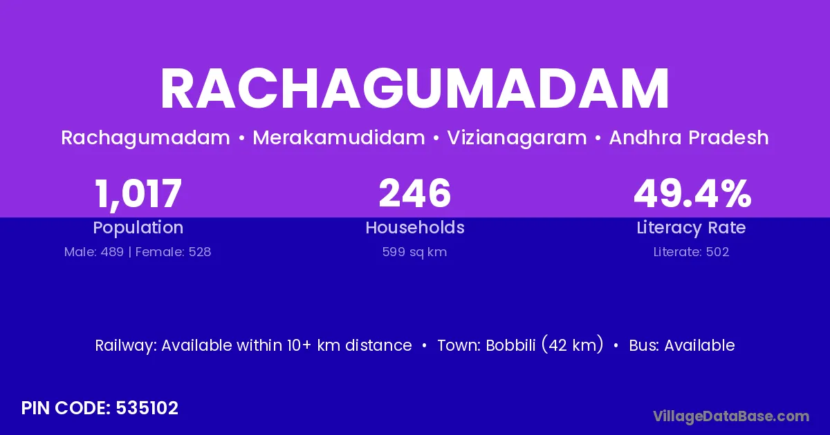 Bobbili (42 km) is the nearest town to Rachagumadam village for major economic activities and is located approximately 42 km away.