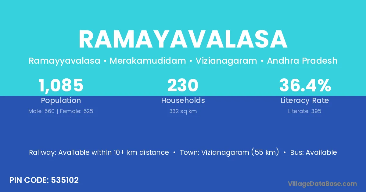 Ramayavalasa village has a total population of 1,085 people, of which 560 are males and 525 are females.