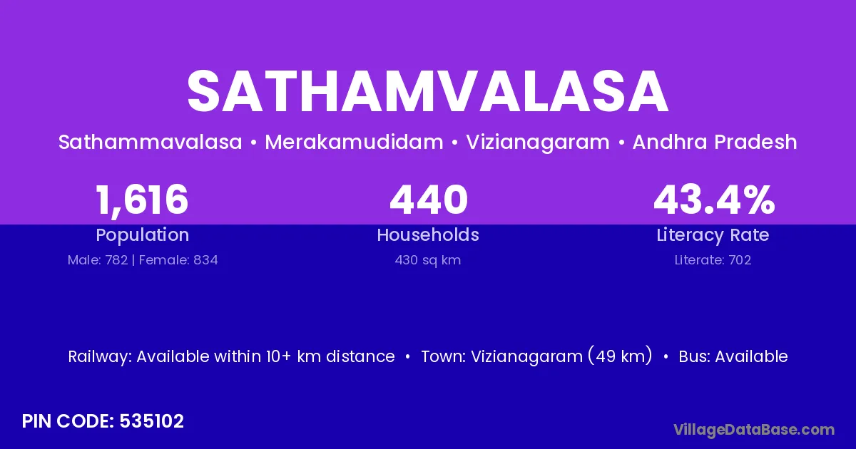 Vizianagaram (49 km) is the nearest town to Sathamvalasa village for major economic activities and is located approximately 49 km away.