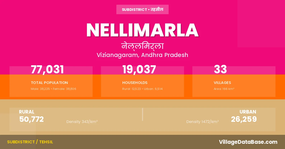 According to the 2011 census The total area of Nellimarla Mandal is 166 km², with a population of 77031 people. The population density is 465 inhabitants per square kilometre, and there are approximately 19037 houses in the sub district.