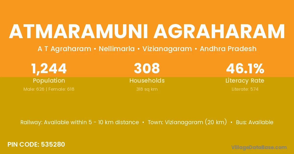 Vizianagaram (20 km) is the nearest town to Atmaramuni Agraharam village for major economic activities and is located approximately 20 km away.