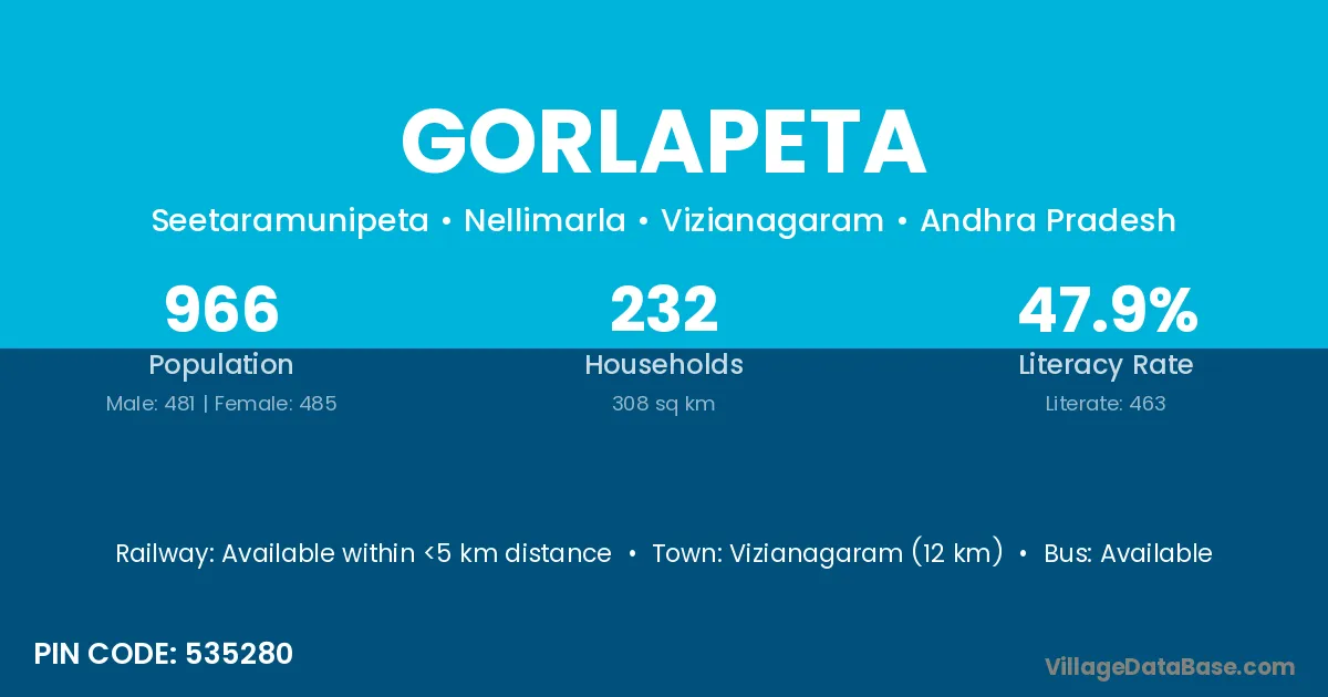 Gorlapeta village has a total population of 966 people, of which 481 are males and 485 are females.