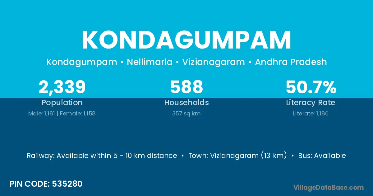 Vizianagaram (13 km) is the nearest town to Kondagumpam village for major economic activities and is located approximately 13 km away.