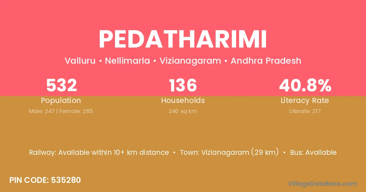 Pedatharimi village has a total population of 532 people, of which 247 are males and 285 are females.