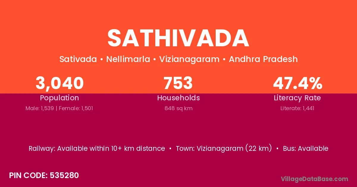 Vizianagaram (22 km) is the nearest town to Sathivada village for major economic activities and is located approximately 22 km away.
