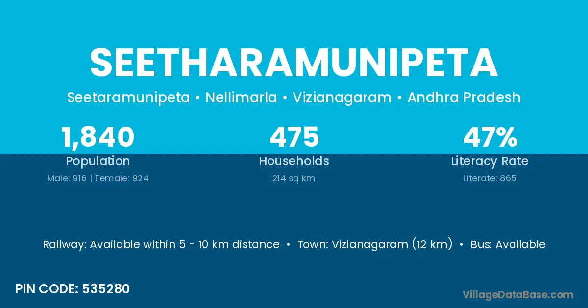 Vizianagaram (12 km) is the nearest town to Seetharamunipeta village for major economic activities and is located approximately 12 km away.