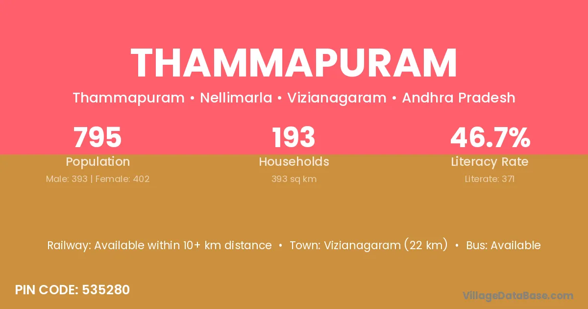 Vizianagaram (22 km) is the nearest town to Thammapuram village for major economic activities and is located approximately 22 km away.