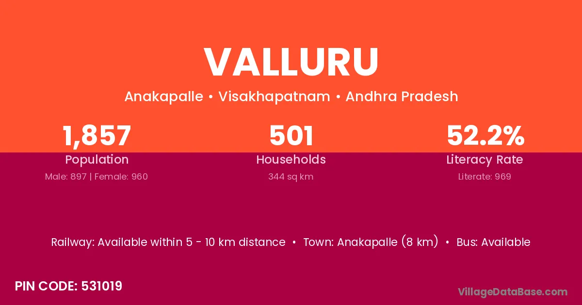 Vizianagaram (30 km) is the nearest town to Valluru village for major economic activities and is located approximately 30 km away.