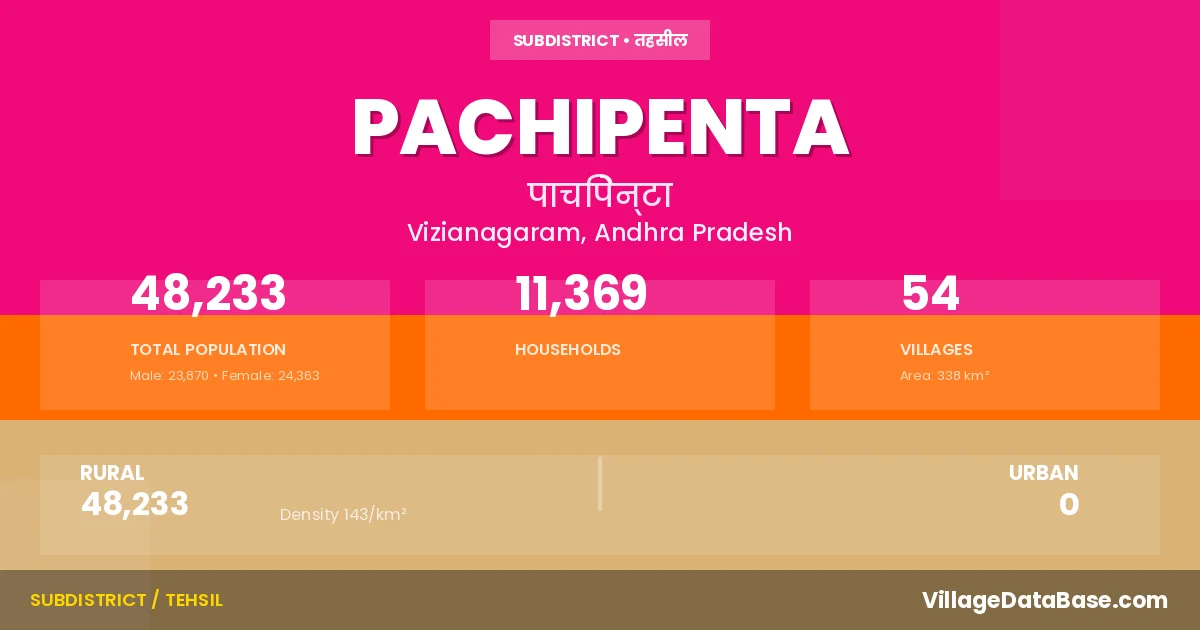 According to the 2011 census The total area of Pachipenta Mandal is 338 km², with a population of 48233 people. The population density is 143 inhabitants per square kilometre, and there are approximately 11369 houses in the sub district.