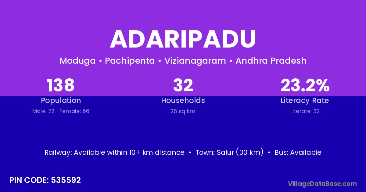 Salur (30 km) is the nearest town to Adaripadu village for major economic activities and is located approximately 30 km away.