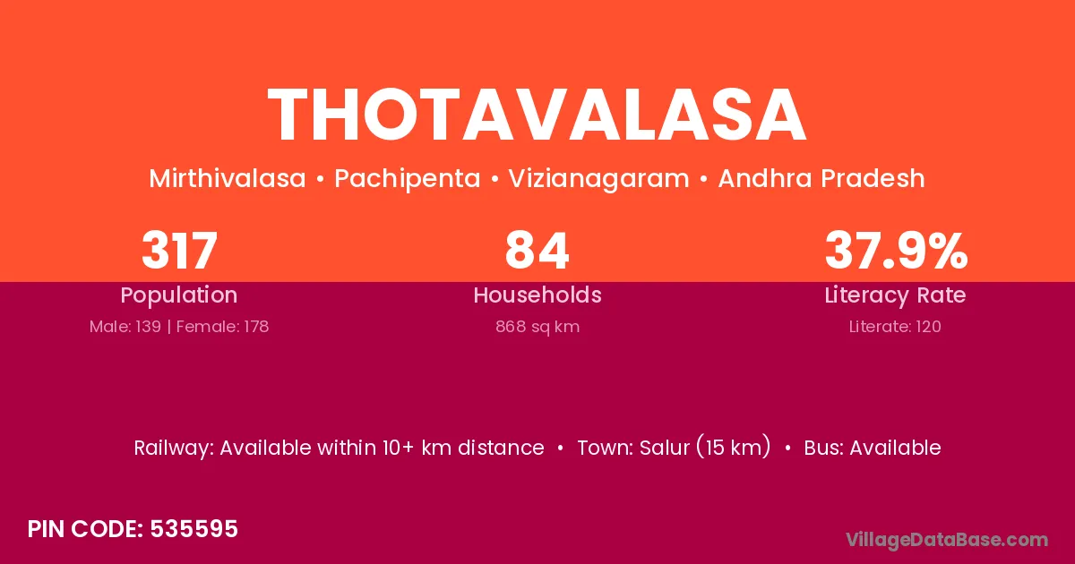 Salur (15 km) is the nearest town to Thotavalasa village for major economic activities and is located approximately 15 km away.