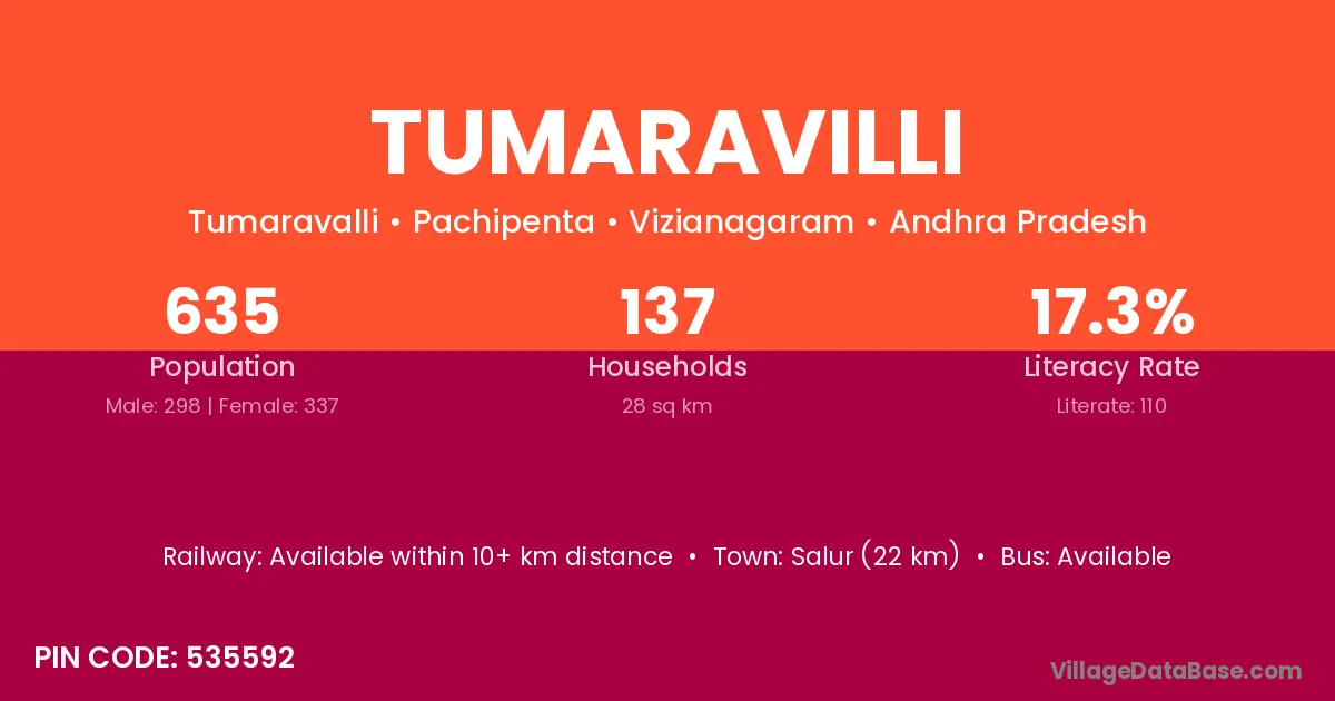 Tumaravilli village has a total population of 635 people, of which 298 are males and 337 are females.