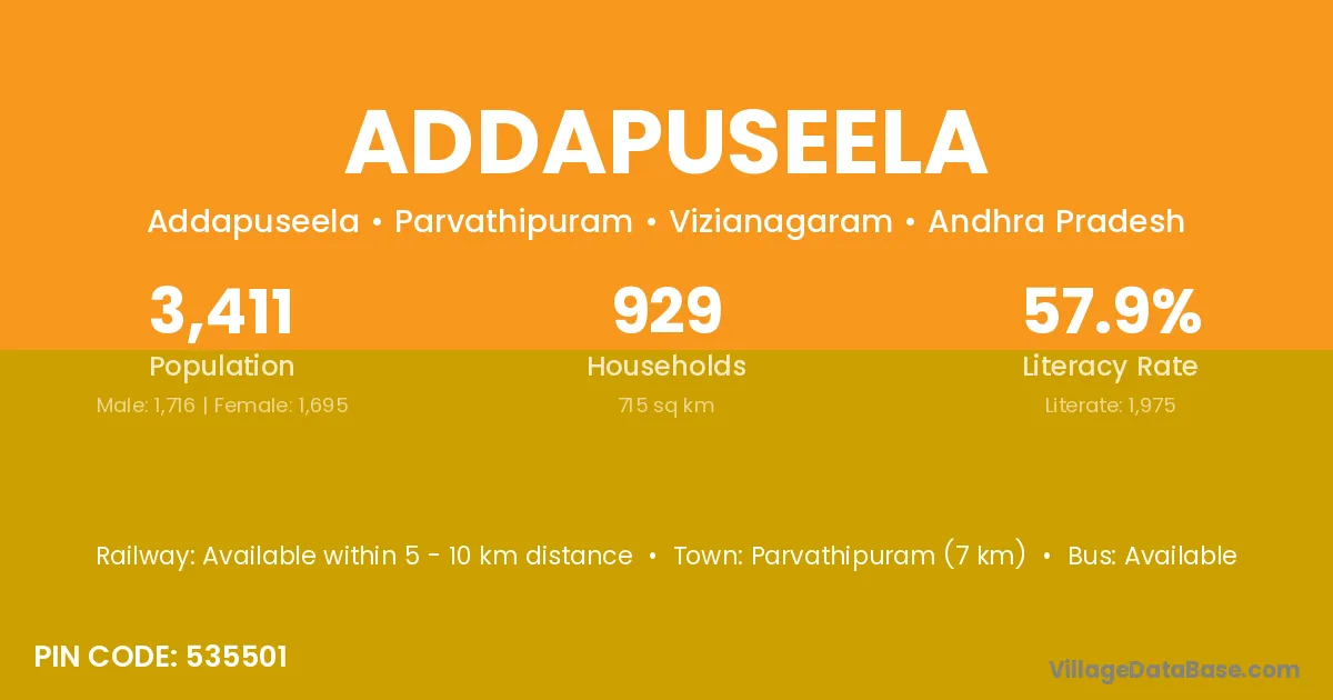 Parvathipuram (7 km) is the nearest town to Addapuseela village for major economic activities and is located approximately 7 km away.