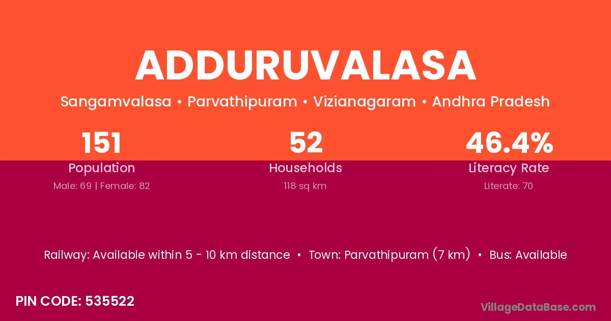 Adduruvalasa village has a total population of 151 people, of which 69 are males and 82 are females.