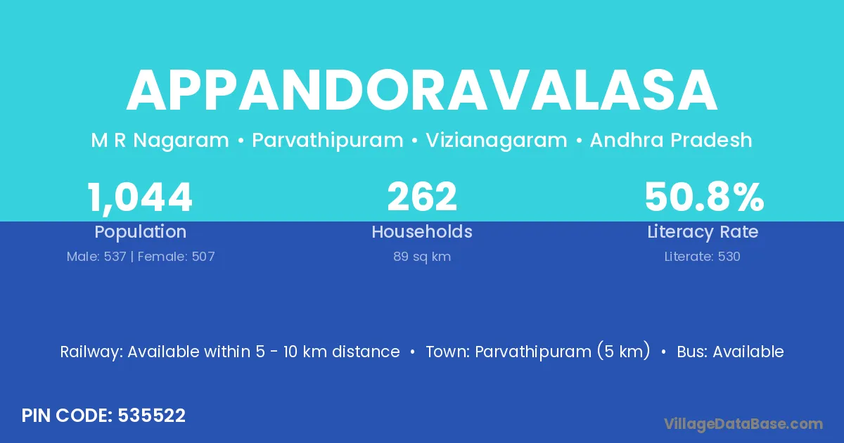 Appandoravalasa village has a total population of 1,044 people, of which 537 are males and 507 are females.
