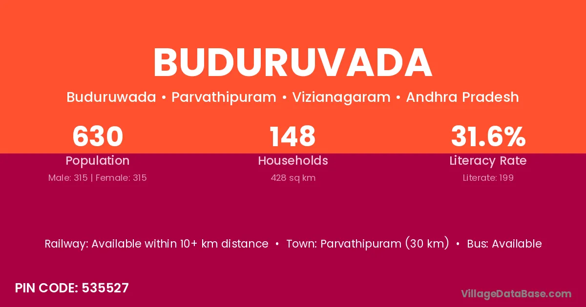 Buduruvada village has a total population of 630 people, of which 315 are males and 315 are females.