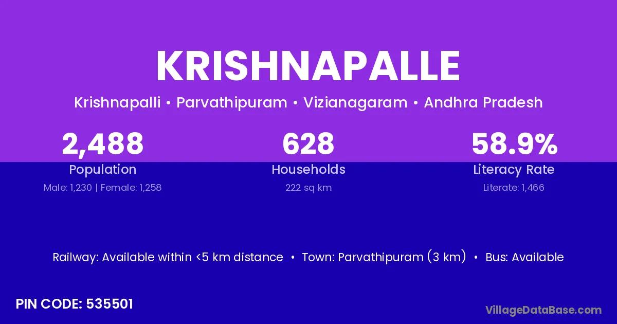 Parvathipuram (3 km) is the nearest town to Krishnapalle village for major economic activities and is located approximately 3 km away.