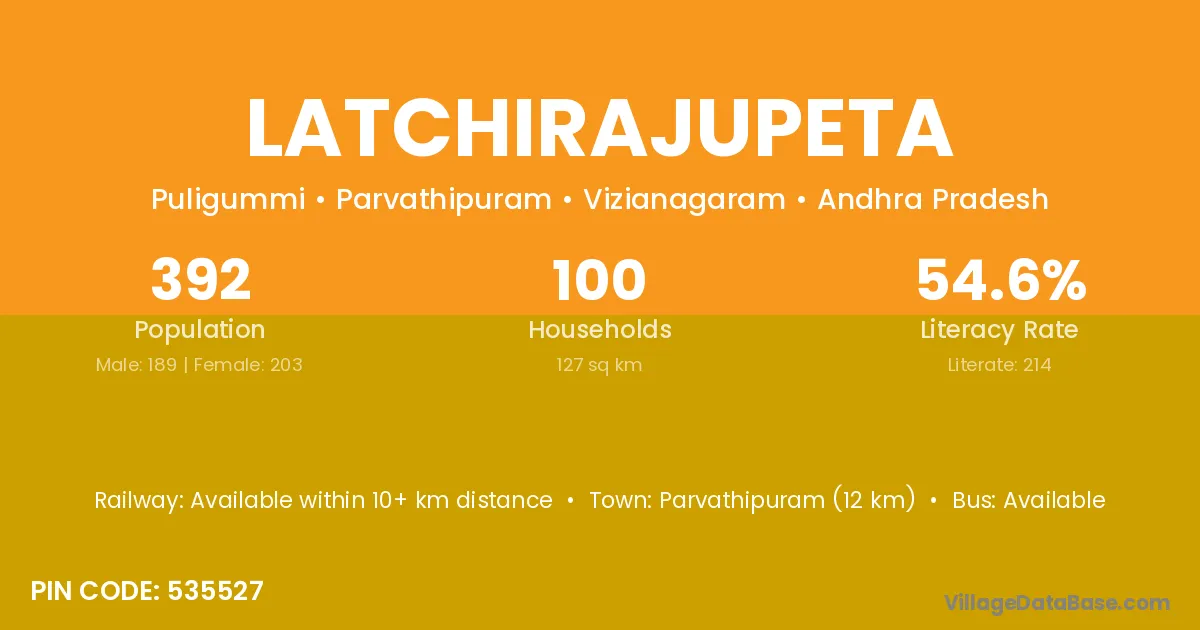 Parvathipuram (12 km) is the nearest town to Latchirajupeta village for major economic activities and is located approximately 12 km away.