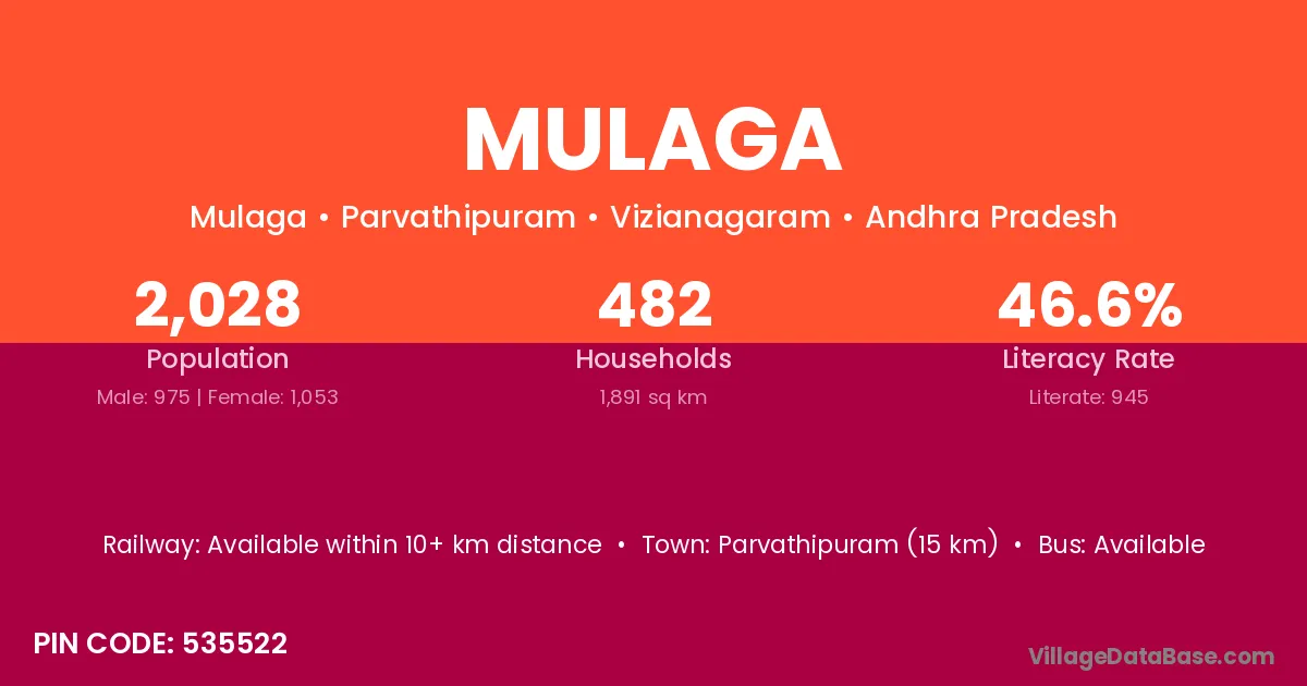 Parvathipuram (15 km) is the nearest town to Mulaga village for major economic activities and is located approximately 15 km away.