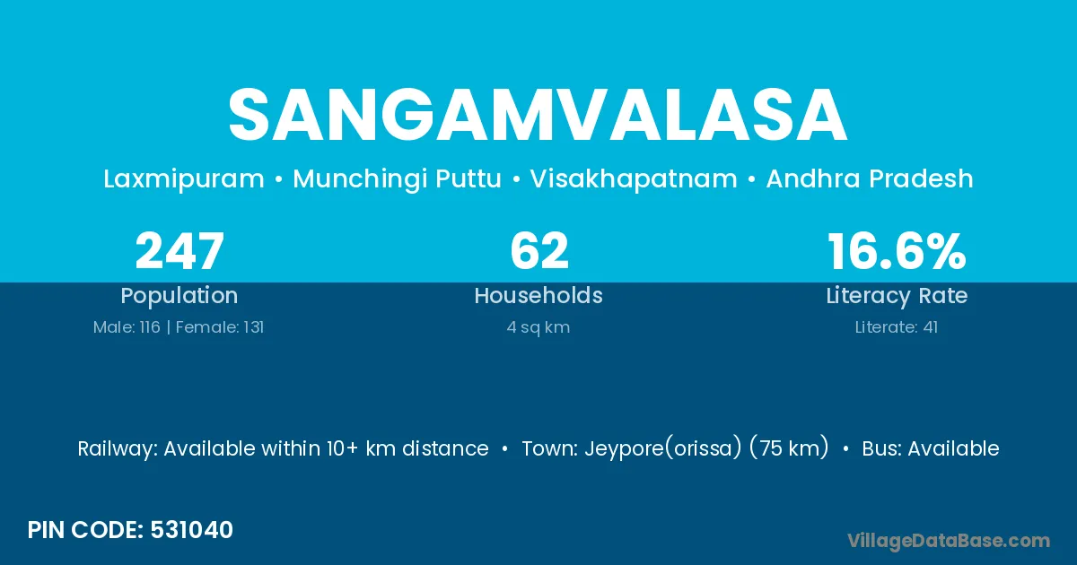 Parvathipuram (6 km) is the nearest town to Sangamvalasa village for major economic activities and is located approximately 6 km away.