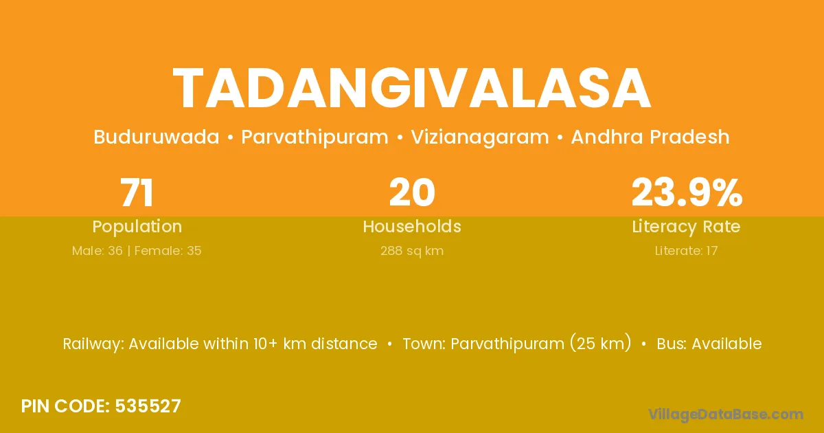 Tadangivalasa village has a total population of 71 people, of which 36 are males and 35 are females.