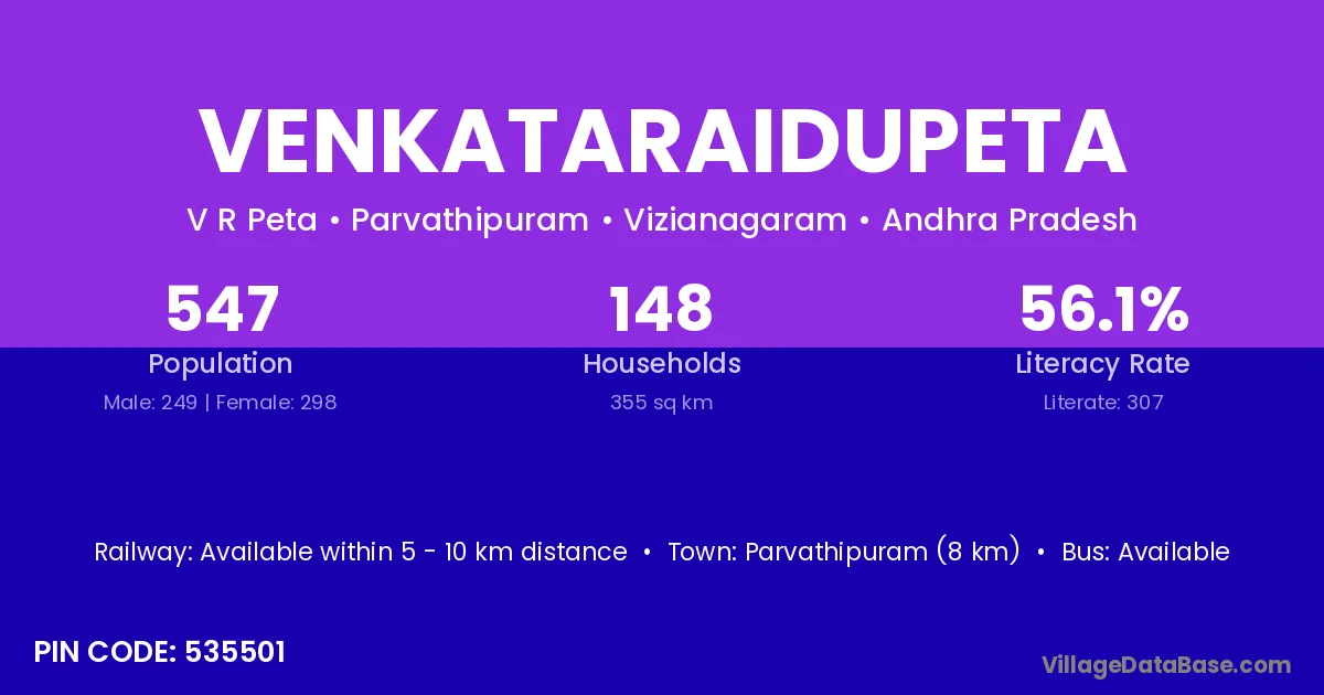 Parvathipuram (8 km) is the nearest town to Venkataraidupeta village for major economic activities and is located approximately 8 km away.