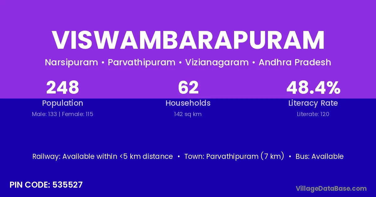 Parvathipuram (7 km) is the nearest town to Viswambarapuram village for major economic activities and is located approximately 7 km away.