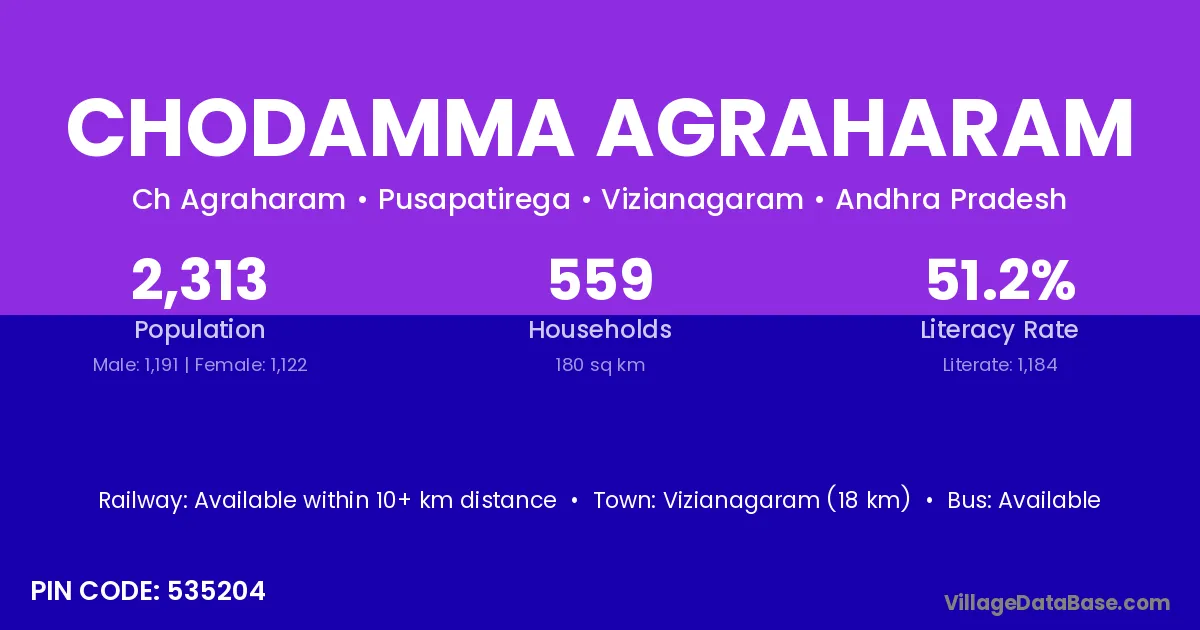 Vizianagaram (18 km) is the nearest town to Chodamma Agraharam village for major economic activities and is located approximately 18 km away.