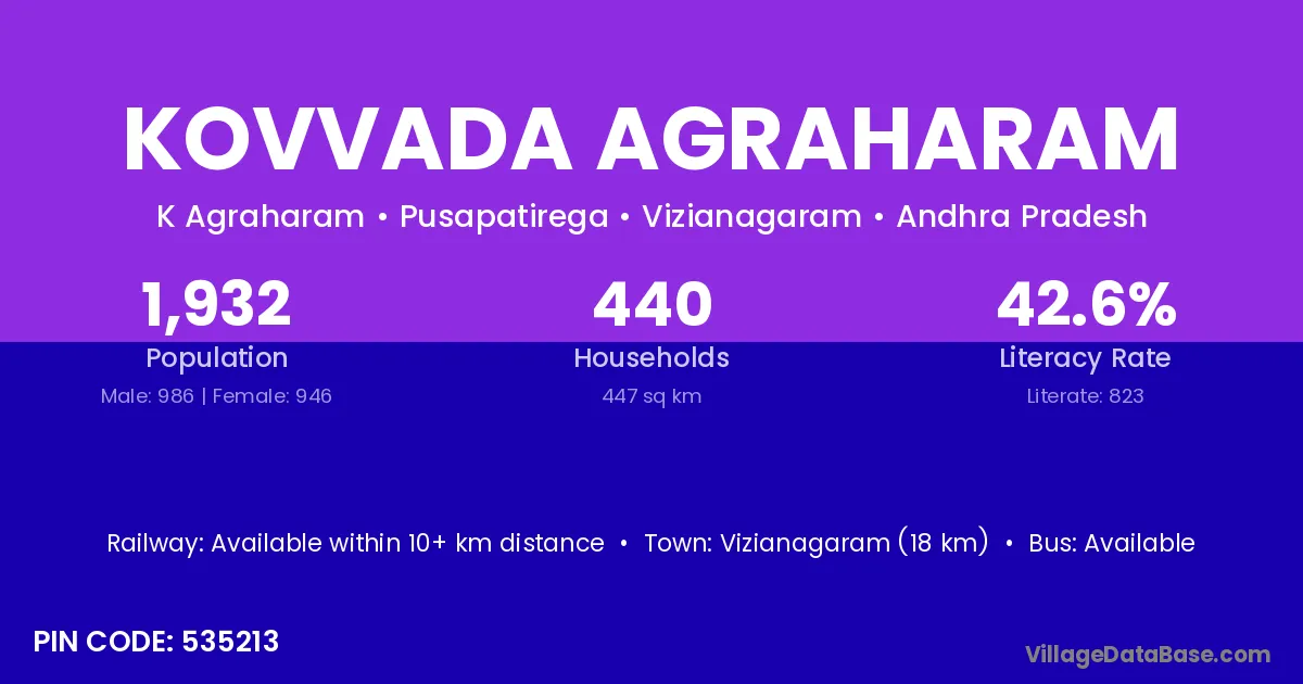 Kovvada Agraharam village has a total population of 1,932 people, of which 986 are males and 946 are females.