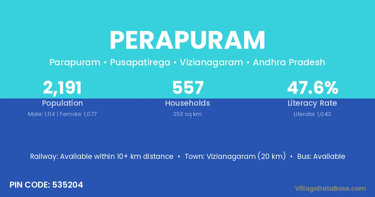 Perapuram village has a total population of 2,191 people, of which 1,114 are males and 1,077 are females.