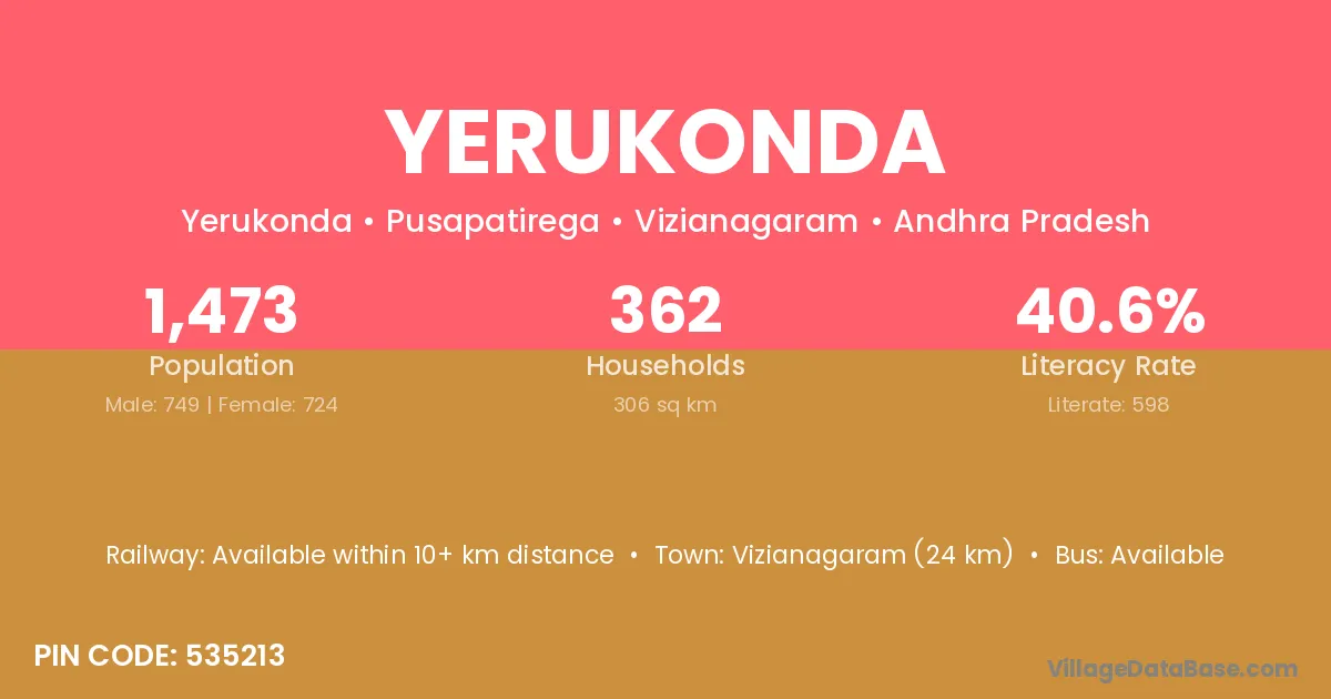 Vizianagaram (24 km) is the nearest town to Yerukonda village for major economic activities and is located approximately 24 km away.