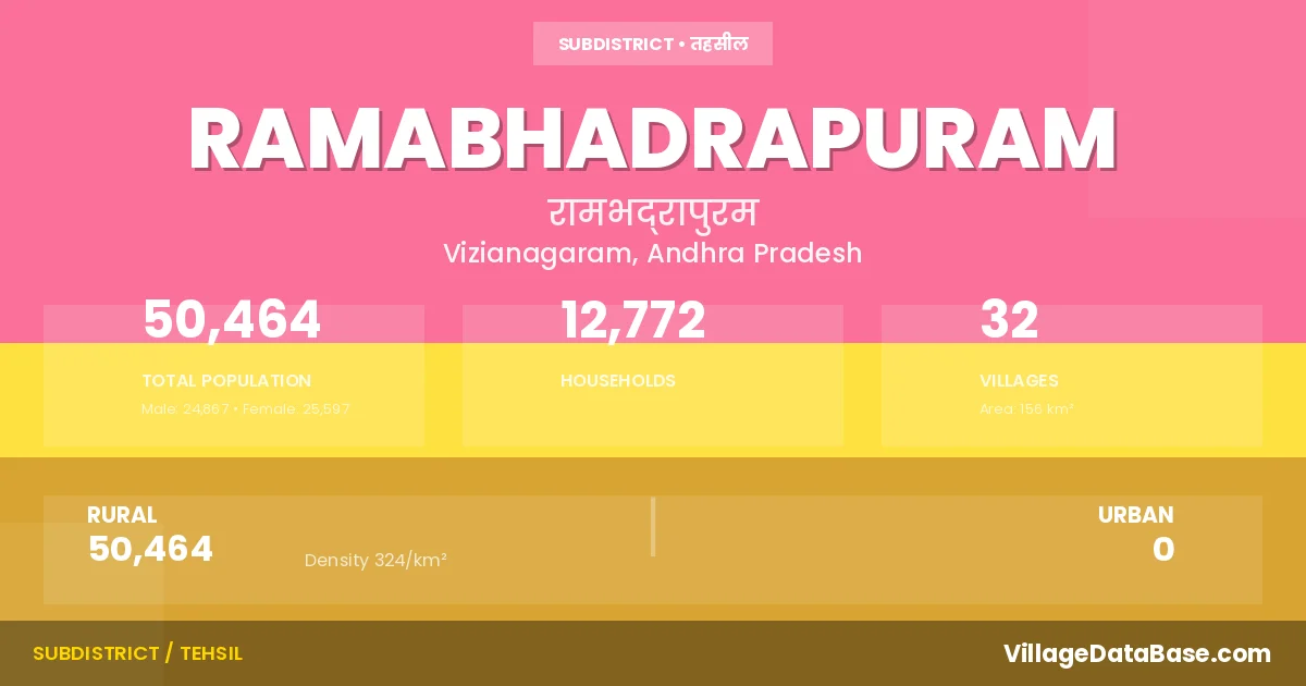 According to the 2011 census The total area of Ramabhadrapuram Mandal is 156 km², with a population of 50464 people. The population density is 324 inhabitants per square kilometre, and there are approximately 12772 houses in the sub district.