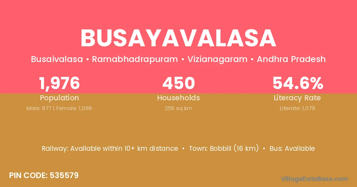 Bobbili (16 km) is the nearest town to Busayavalasa village for major economic activities and is located approximately 16 km away.
