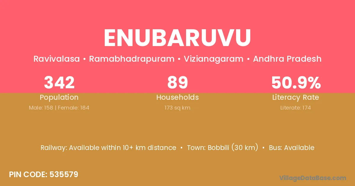 Bobbili (30 km) is the nearest town to Enubaruvu village for major economic activities and is located approximately 30 km away.