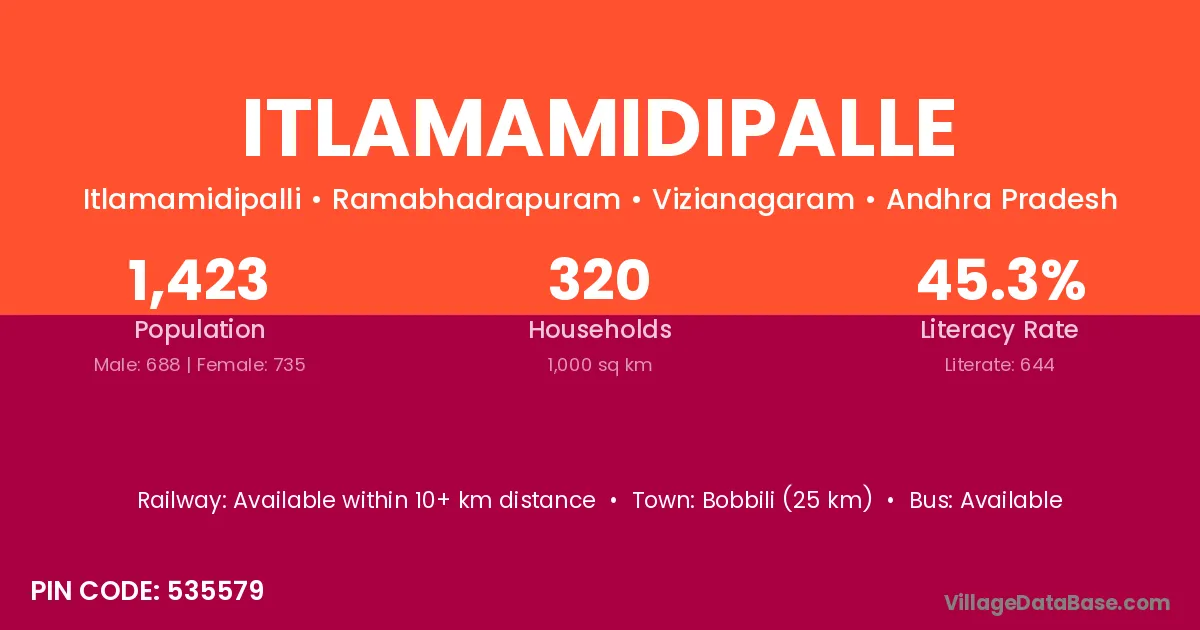 Bobbili (25 km) is the nearest town to Itlamamidipalle village for major economic activities and is located approximately 25 km away.