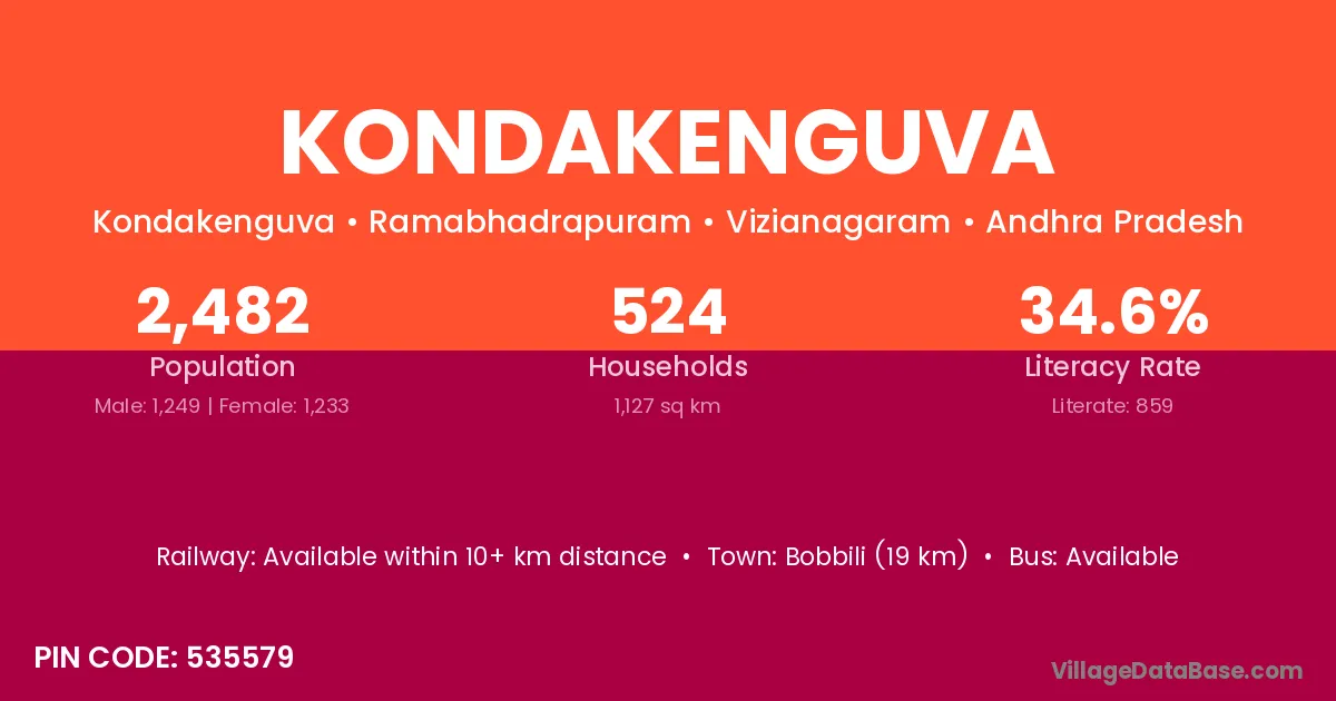 Bobbili (19 km) is the nearest town to Kondakenguva village for major economic activities and is located approximately 19 km away.