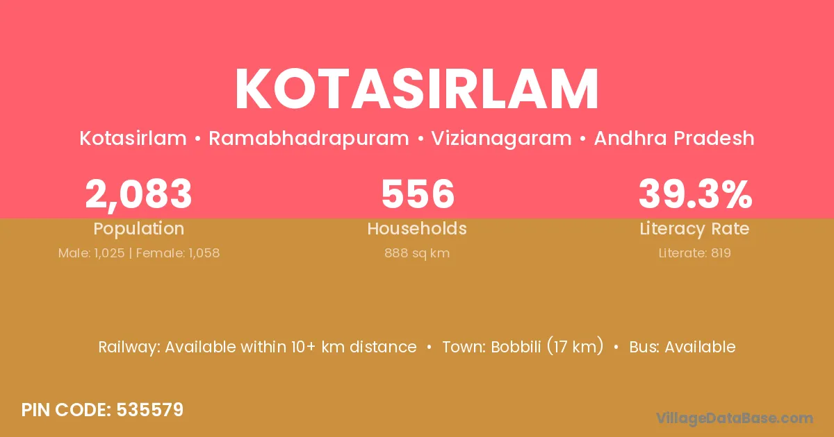 Bobbili (17 km) is the nearest town to Kotasirlam village for major economic activities and is located approximately 17 km away.