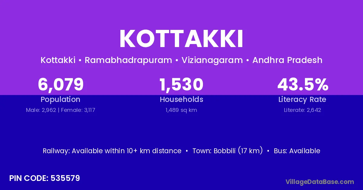 Kottakki village has a total population of 6,079 people, of which 2,962 are males and 3,117 are females.