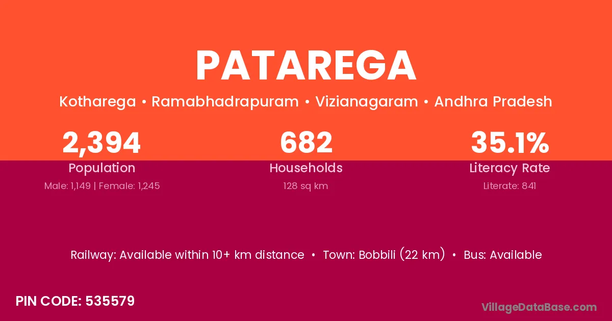 Bobbili (22 km) is the nearest town to Patarega village for major economic activities and is located approximately 22 km away.