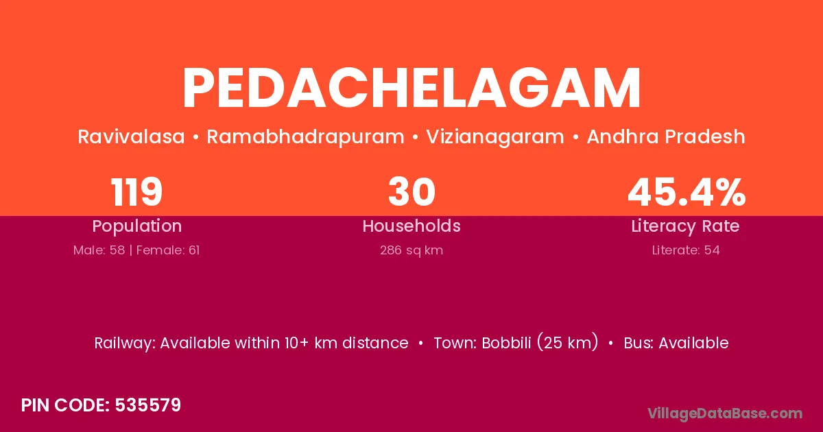 Bobbili (25 km) is the nearest town to Pedachelagam village for major economic activities and is located approximately 25 km away.