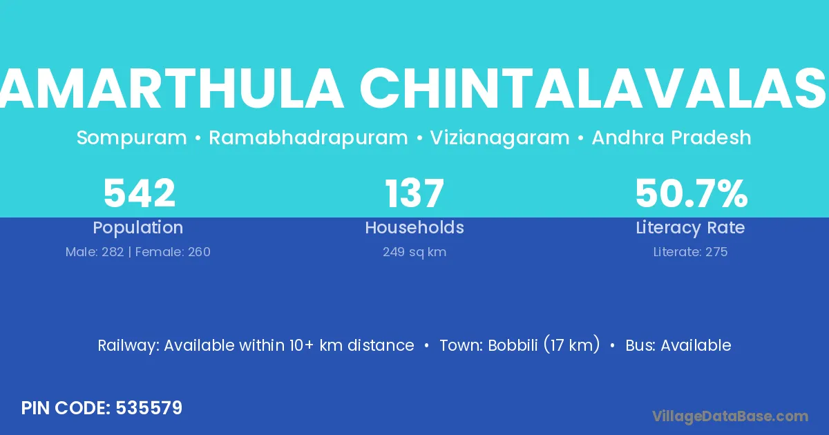 Samarthula Chintalavalasa village has a total population of 542 people, of which 282 are males and 260 are females.