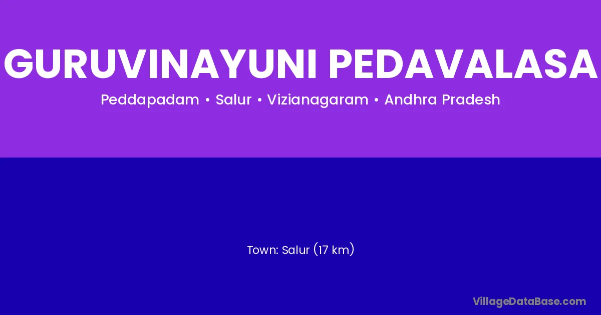 Salur (17 km) is the nearest town to Guruvinayuni Pedavalasa village for major economic activities and is located approximately 17 km away.