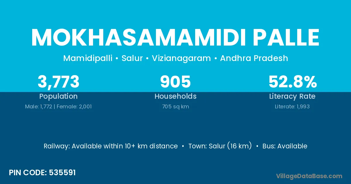 Mokhasamamidi Palle village has a total population of 3,773 people, of which 1,772 are males and 2,001 are females.