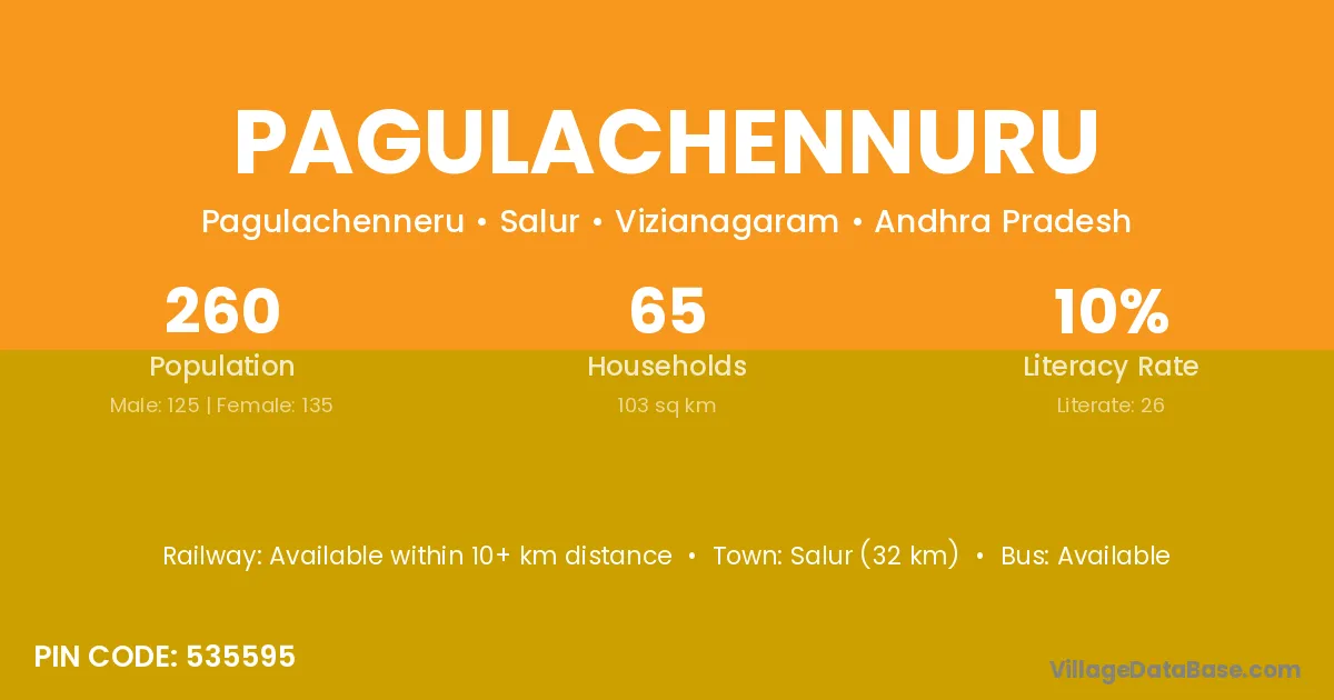 Salur (32 km) is the nearest town to Pagulachennuru village for major economic activities and is located approximately 32 km away.
