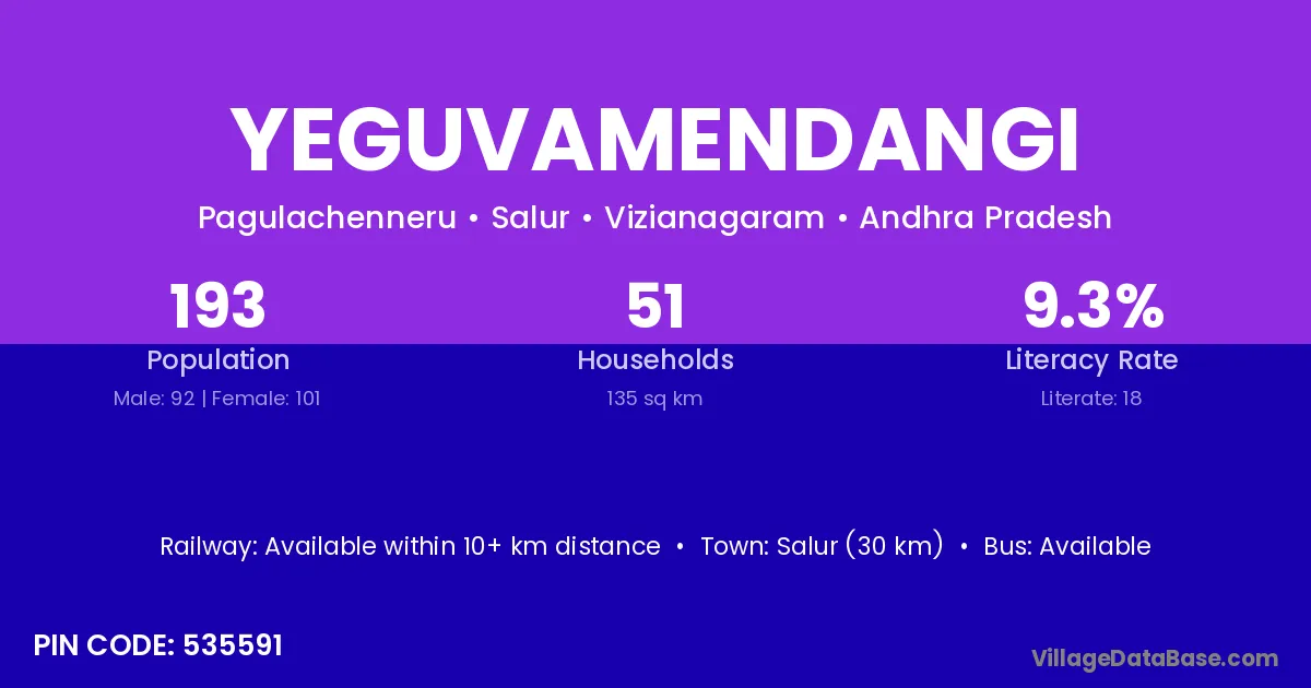 Yeguvamendangi village has a total population of 193 people, of which 92 are males and 101 are females.