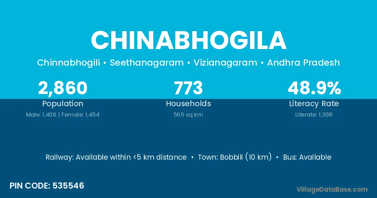 Bobbili (10 km) is the nearest town to Chinabhogila village for major economic activities and is located approximately 10 km away.