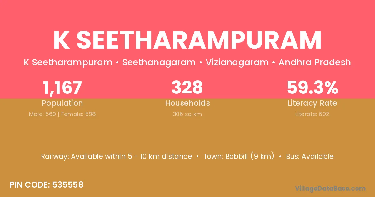 K Seetharampuram village has a total population of 1,167 people, of which 569 are males and 598 are females.
